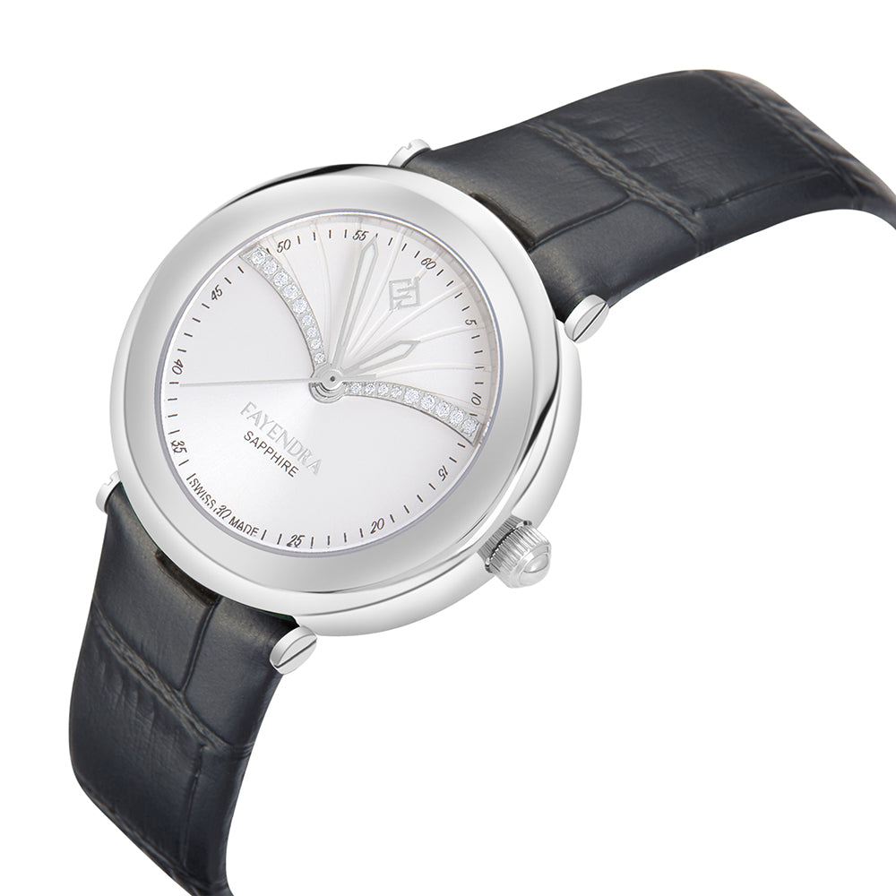 تألّقي بفخامة راقية مع هذه الساعة الأنيقة من فايندرا، المصنوعة من ستانلس ستيل عيار L316 باللون الفضي اللامع الذي يعكس بساطة التصميم ورقيّ التفاصيل. تأتي بمينا معدنية باللون الفضي مزدانة بنقشة شعاعية متقنة تمنحها عمقًا بصريًا مميزًا، فيما ينساب خط من الفص الأبيض اللامع على شكل قوس رقيق ليضيف لمسة أنوثة وبريقًا يخطف الأنظار.