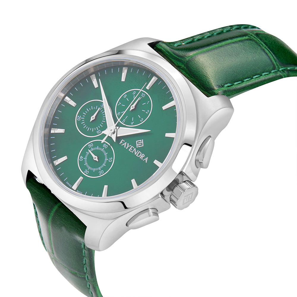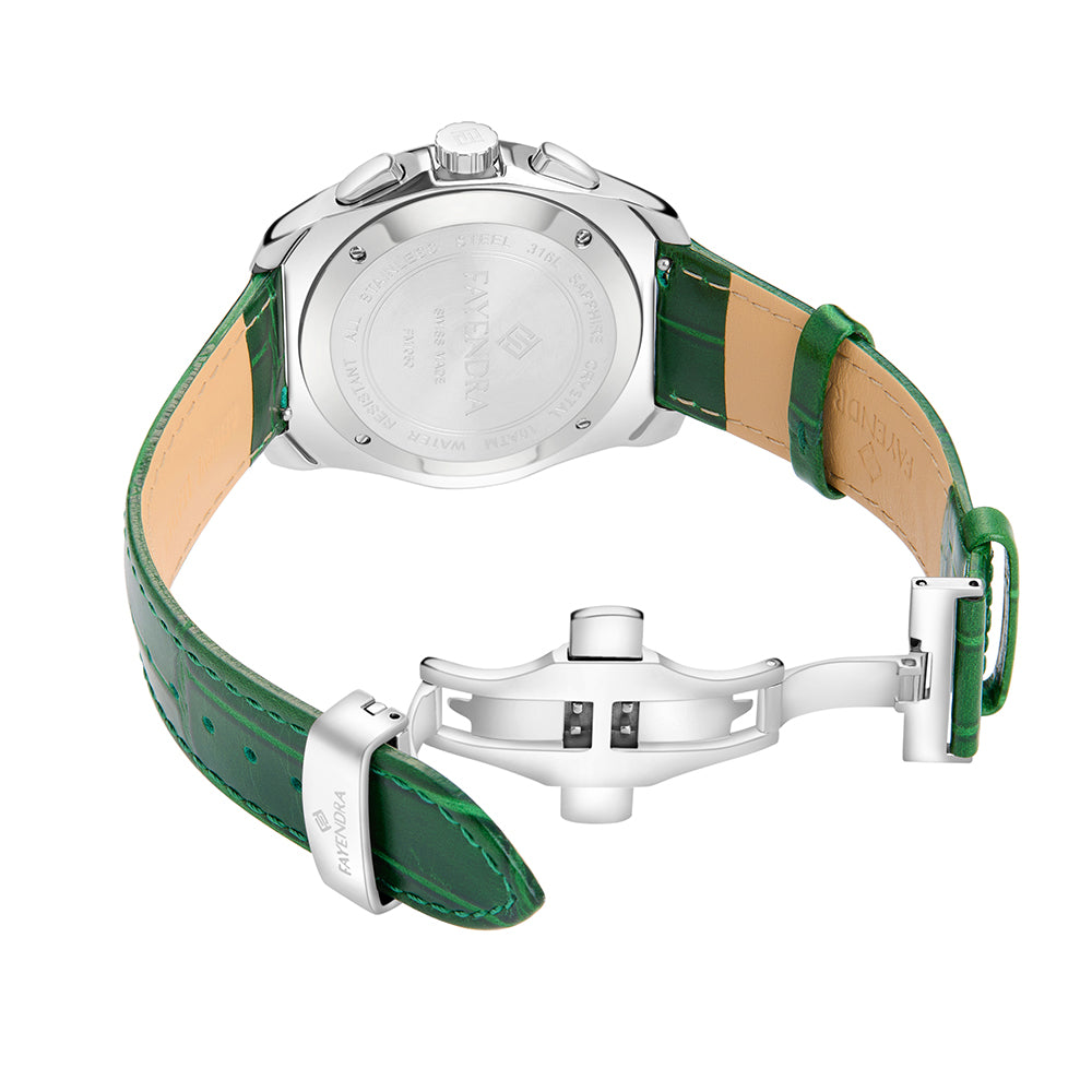 تميّز بإطلالة تجمع بين الجرأة والفخامة مع هذه الساعة الرجالية الراقية من فايندرا، المصنوعة من ستانلس ستيل عيار L316 باللون الفضي المصقول. يتميّز هيكلها بتصميم رياضي قوي ذو حواف بارزة يمنح الساعة حضورًا رجوليًا لا يمكن تجاهله، بينما يضفي سوار الجلد الأخضر الفاخر لمسة عصرية متفرّدة تزيد من جاذبية التصميم.