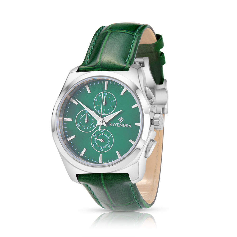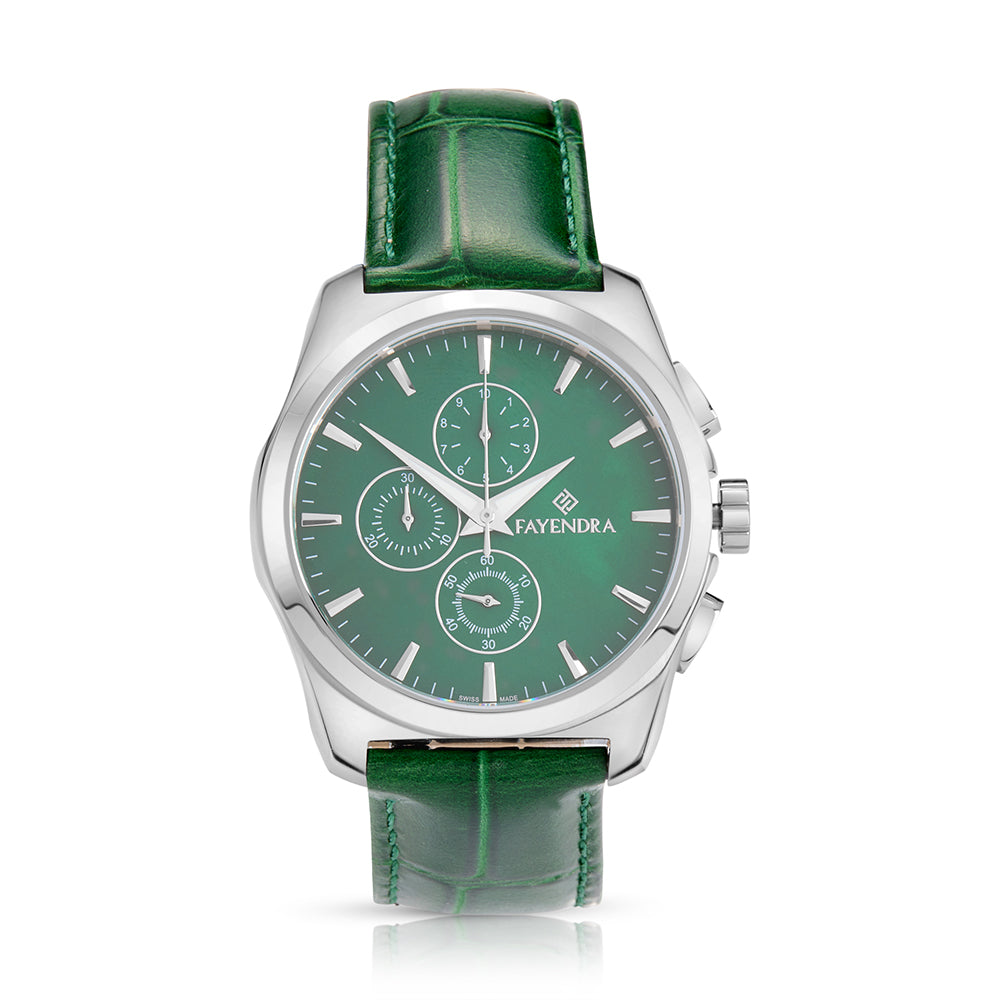 وتتألق الساعة بمينا فاخرة من حجر صدف أم اللآلئ الأخضر بتدرّجاته الحيوية ولمعانه الطبيعي الأخّاذ، مع ثلاث عدّادات بأسلوب الكرونوغراف تضيف عمقًا ديناميكيًا وأناقة تقنية للمظهر. وتبرز المؤشرات المعدنية الدقيقة بشكل واضح يمنحك قراءة سهلة وأناقة راقية.