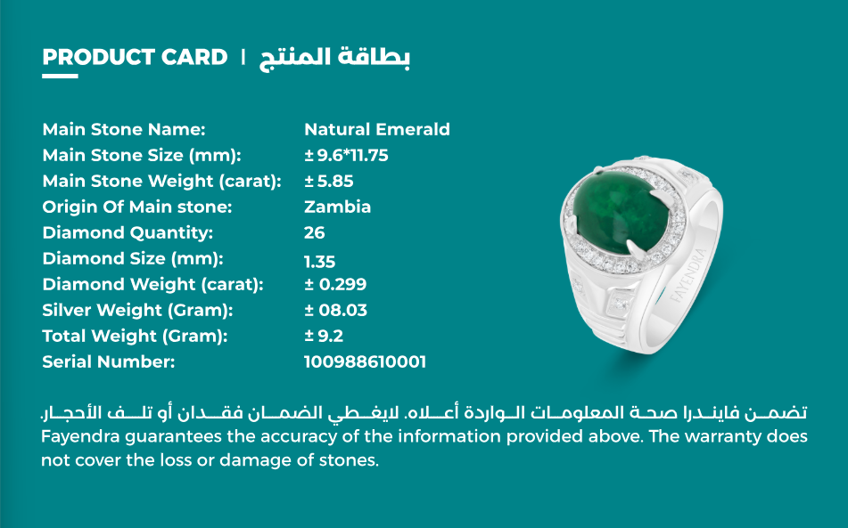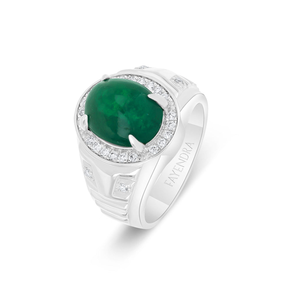 خاتم رجالي عيار 925 مطلي روديوم مرصع بحجر الزمرد الطبيعي و الالماس الطبيعي سي في دي جودة في في اس